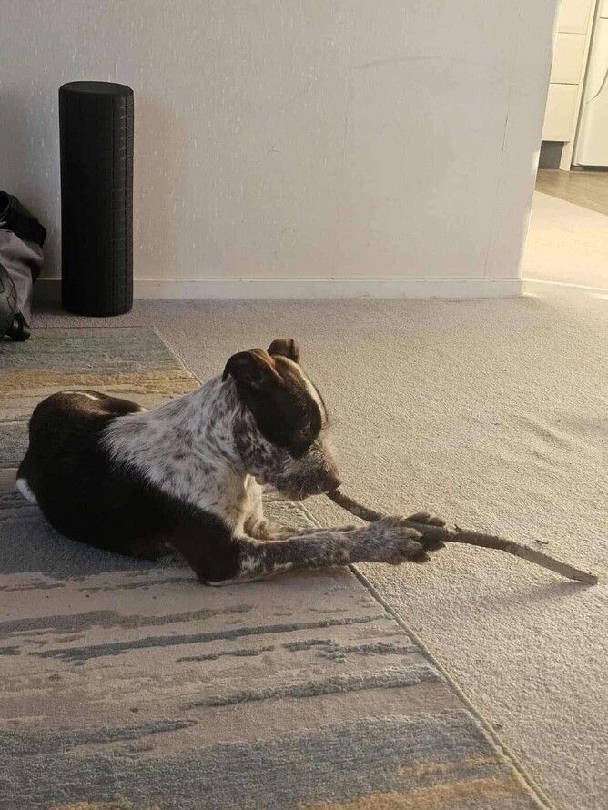 Diego has spent his first night in his new home. He is happily chewing on his stick. Thanks to Jason for adopting this gorgeous boy. Diego will live his best life now and will be going on lots of new pawsome adventures.